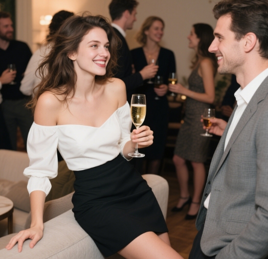 At a friend's gathering where people are chatting in small groups, a woman in a white off-the-shoulder top and a black skirt leans against the sofa, holding a glass of champagne. Her hair is slightly disheveled over her shoulders, and her eyes are misty yet full of a hint of charm. When a friend talks to her, she smiles softly, answering clearly and appropriately, and occasionally winks playfully. Her natural and unpretentious behavior shows that even when tipsy, she can maintain her elegance and allure. The man in a gray suit jacket beside her is drawn to her charisma and glances at her from time to time. Maintaining good manners and a sense of self-awareness while tipsy is key to remaining charming in social settings.