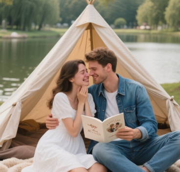 On their anniversary, the couple goes to the park where they first met. By the lake in the park, a small tent has been set up. Inside the tent, there is a soft blanket, and around it are many photos of the two of them. The man is wearing a blue denim jacket and jeans, and the woman is in a white dress. They sit together in the tent, reminiscing about the beautiful moments they've shared in the past. The man then takes out a customized anniversary photo album that records every precious moment from their first meeting to their deep love. The woman is moved to tears, and they hug each other tightly, cherishing this special love. This nostalgic anniversary plan not only evokes sweet memories but also strengthens their emotional bond, making it a “customized sexy” way to celebrate their love.