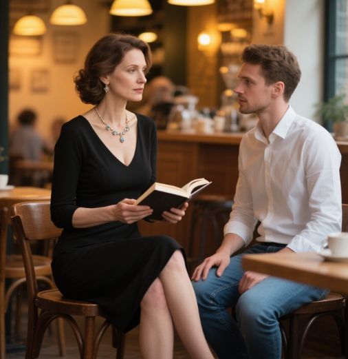 In a cozy café with warm yellow lighting, an older woman in a black fitted dress and a delicate necklace sits gracefully in a chair, holding a book in her hand. She is sharing her life insights and experiences with a younger man in a white shirt and blue jeans. The younger man listens attentively, his eyes showing respect and admiration for the older woman. He is also attracted by her mature charm. In an intimate setting like a café, the older partner's ability to share meaningful life experiences and wisdom can create a deep connection. It shows a level of emotional maturity and understanding that can make the younger partner feel more connected and attracted.