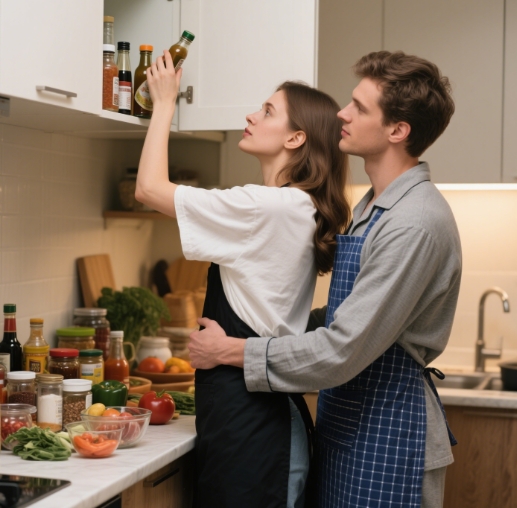 In the relatively confined space of the kitchen, physical contacts are inevitable when cooking together. It could be the touch of fingers when passing a tool, the slight brush of shoulders when turning around, or one person hugging the other from behind to help reach for something. These accidental physical contacts can make your heart race and create an electrifying current between you, establishing an ambiguous and sexy atmosphere. These small moments of closeness add a layer of intimacy to the cooking experience, making it more than just a task but a moment of connection.