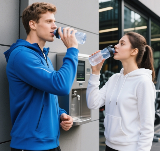 At the water dispenser outside the gym, the man in a blue sports jacket and the woman in a white sports sweatshirt are each holding a water cup. They take big gulps of water to replenish the fluids lost during the workout. After drinking water, the woman takes out a bottle of facial mist from her bag and sprays it gently on her face. Then she pats her face with her hands to help the skin absorb the moisture. Her skin becomes more hydrated, and her complexion improves significantly. Rehydrating both internally and externally is crucial for restoring your skin's radiance and overall vitality after exercise.
