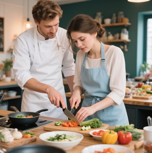 In a warm and cozy cooking studio filled with various ingredients and cooking utensils, you and your partner participate in a cooking class together. Dressed in a white chef's apron, the man and the woman in a light blue apron work side by side, preparing ingredients and cooking delicious dishes. When the woman is cutting vegetables, the man gently stands behind her and holds her hand, guiding her on the correct cutting posture. Their bodies are close, and their eyes are focused on the task at hand. The woman blushes slightly, and a special feeling stirs within her. This intimate collaboration not only allows you to get to know each other better but also creates a sense of closeness and connection through shared activities. The physical proximity and the act of guiding can add a touch of sensuality to the interaction.